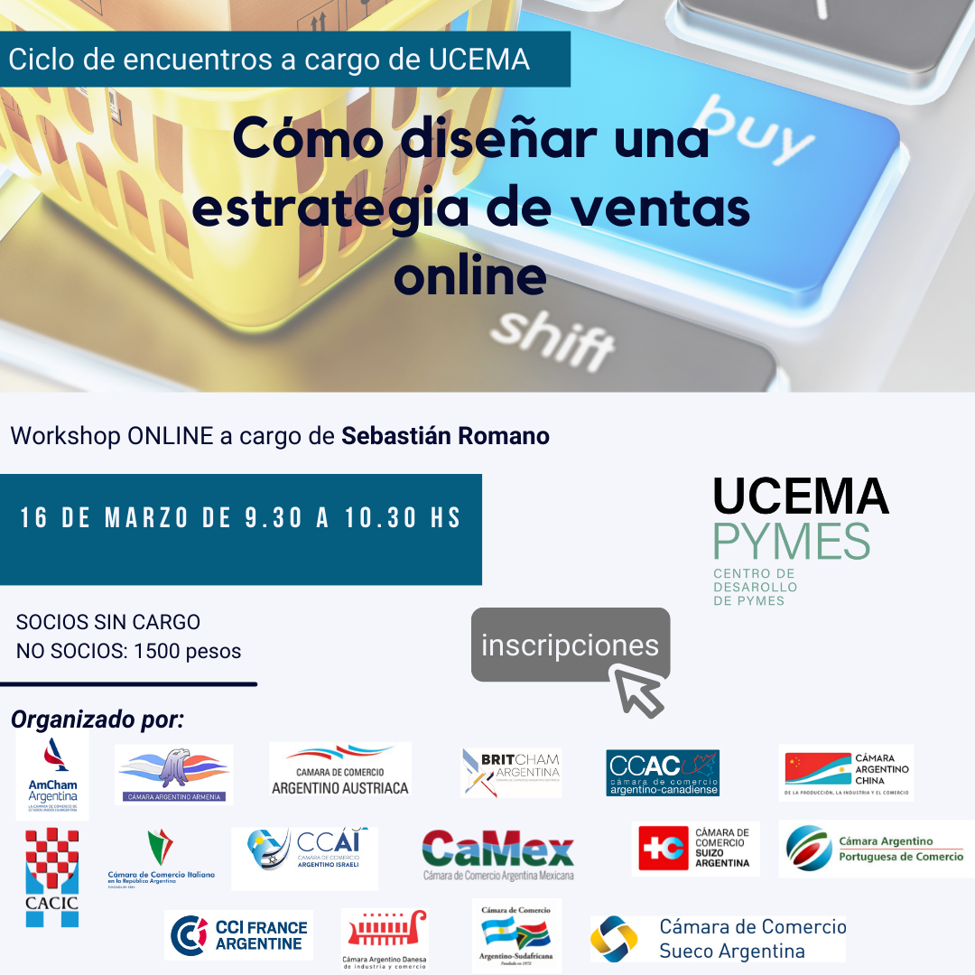 Los invitamos a participar del workshop gratuito «Cómo Diseñar una Estrategia de Ventas Online», organizado conjuntamente entre la Universidad UCEMA y la Unión de Cámaras Binacionales, a realizarse el miércoles 16 de marzo 2022 de 9:30 a 10:30 hs (Arg.). El ciclo es abierto para socios y no socios. El objetivo es agregar valor a través de la divulgación de contenidos.